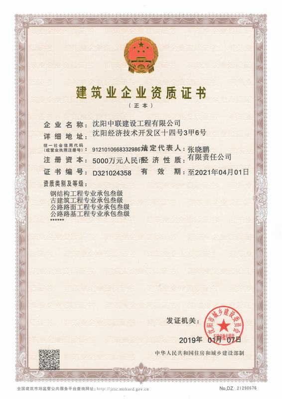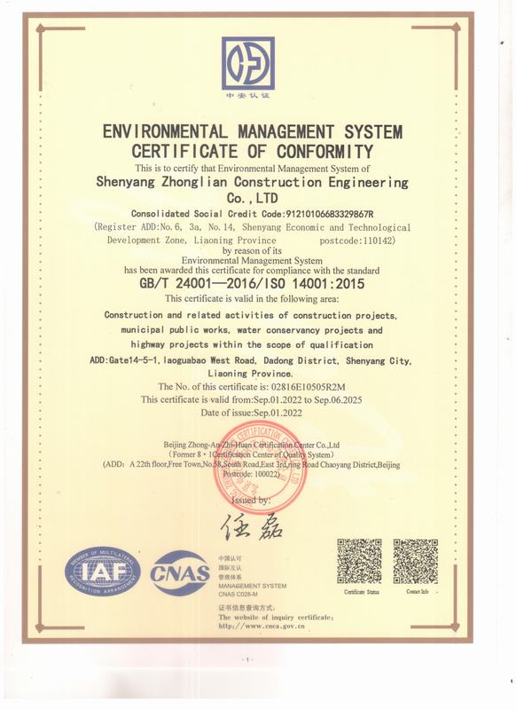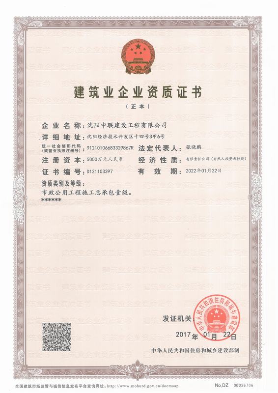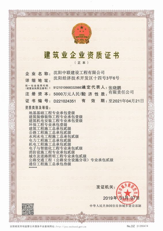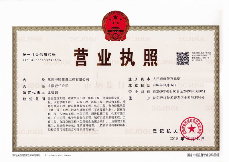 沈阳中联建设工程有限公司,成立于2009年,是一家注册资本5000万,拥有房屋建筑二级、水利水电二级和市政公用工程施工总承包二级资质的有限责任公司,经营范围包括:房屋建筑工程、市政公用工程、机电设备安装工程、水利水电工程、土石方工程、环保工程、钢结构工程、地基与基础工程、装饰装修工程、拆迁工程、爆破与拆除工程、园林绿化工程、电信工程施工、消防设施工程、化工石油工程、矿山工程、电子与智能化工程、建筑防水工程、防腐保温工程、体育场地设施工程、城市及道路照明工程、公路工程施工;土地整理。地处辽宁省沈阳经济技术开发区十四号3甲6号,地理优势优越,交通十分便利。